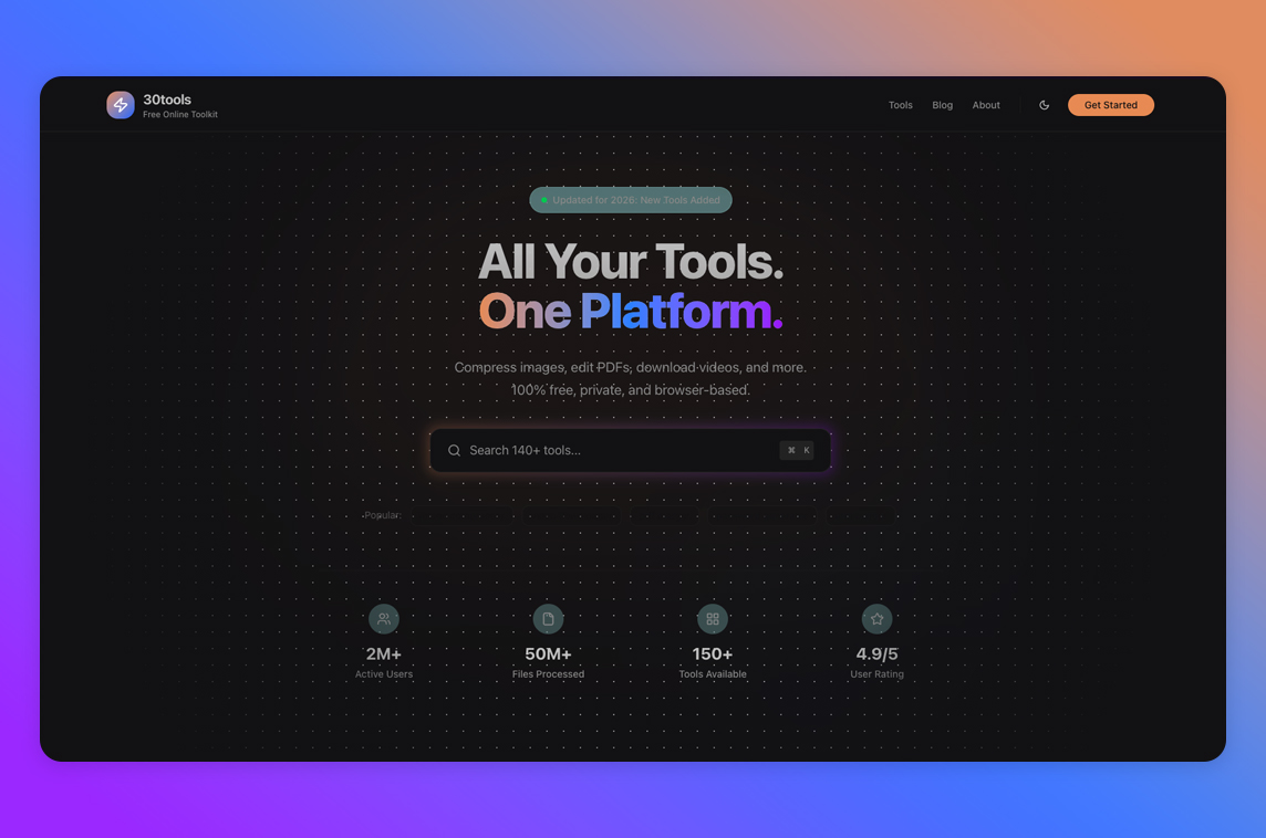 30Tools started as a simple idea: collect the most useful web utilities in one place. What began as a small side project has grown into a comprehensive suite of over 50 tools trusted by thousands of users daily.