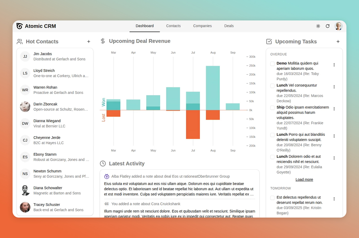 "Atomic is a full-featured CRM toolkit built with React, shadcn/ui, and Supabase. It is designed to be easy to customize and extend by developers with basic React and SQL skills."