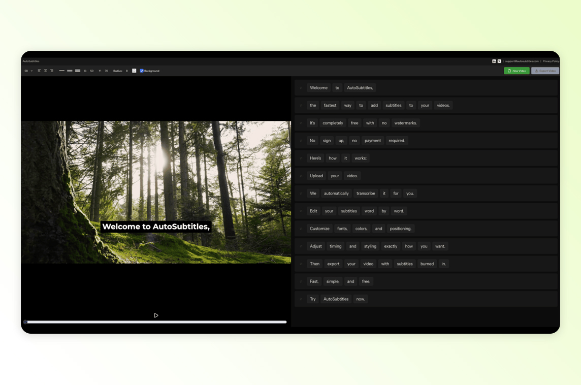 "AutoSubtitles.com lets you add subtitles to your videos instantly — 100% free, no watermark, no signup, no payments. It's AI-powered, fast, and private.