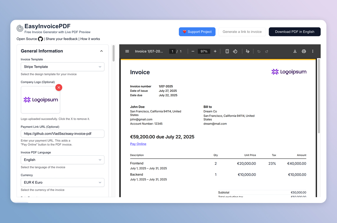 "EasyInvoicePDF is a free & open-Source invoice generator. Live PDF preview, no sign-up, 100% in-browser.
