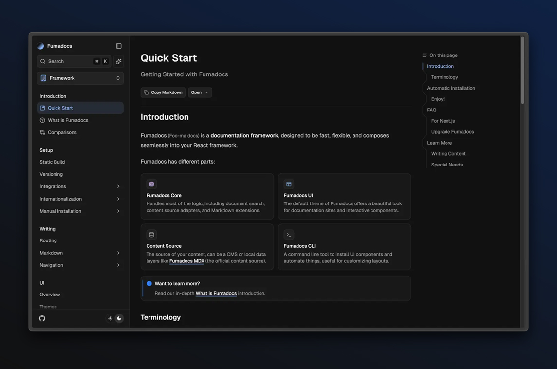 Fumadocs is a beautiful documentation framework for developers, flexible, performant, running on your React framework.