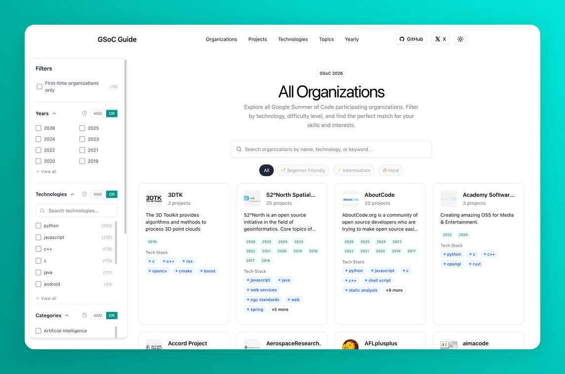 "GSoC Organizations Guide is an open-source, data-driven platform that helps students crack Google Summer of Code (GSoC) by making organization and tech-stack selection simple and strategic.
