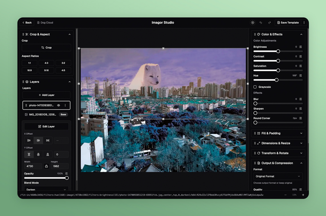 - Multi-layer editing: Edit images with multi-layer compositing and real-time preview. Stack images, add watermarks, create complex compositions. All transformations are URL-based.