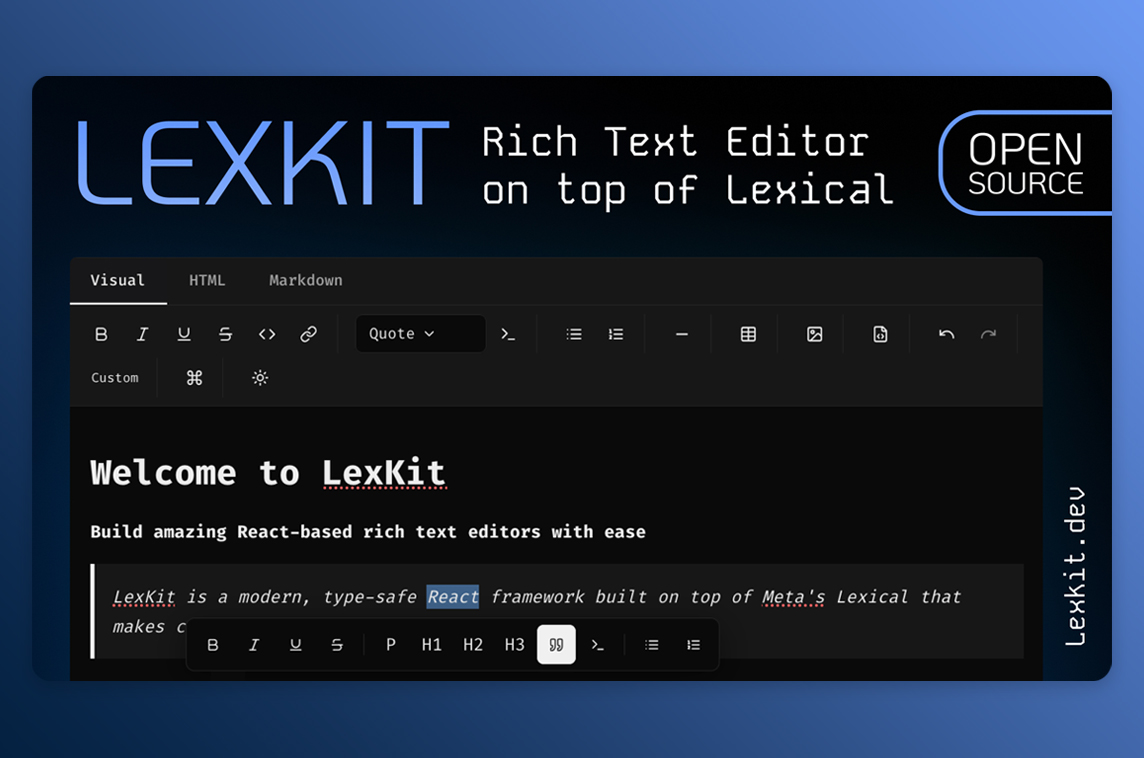 "Tired of fighting rich text editors? Meet LexKit, a headless, extensible editor powered by Lexical.