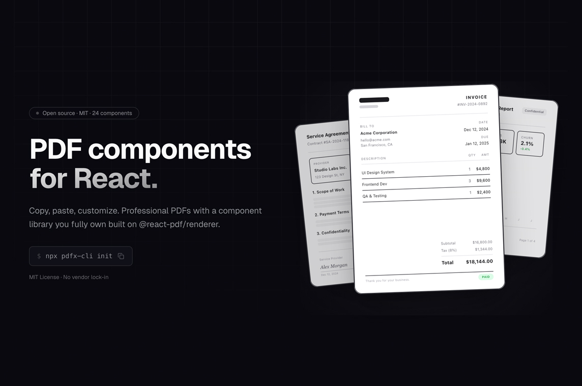 "PDFx is a A React PDF component library with pre-built, themeable components and a CLI for seamless PDF document creation.