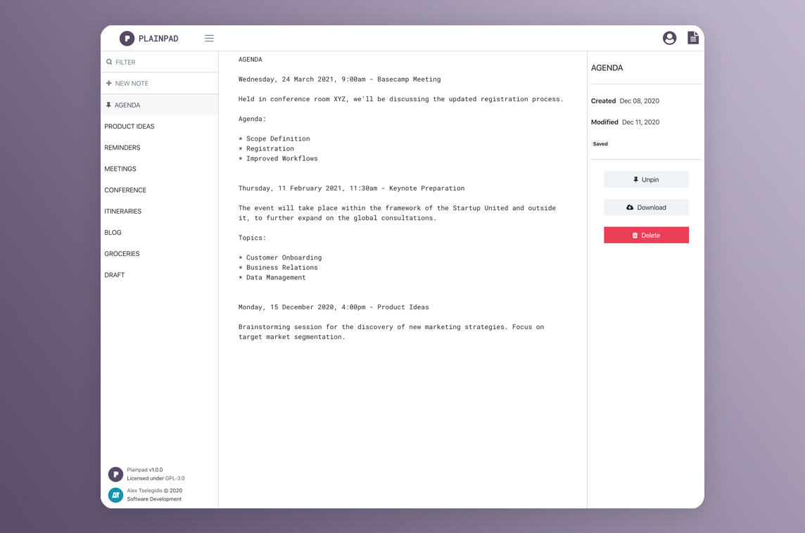 Driven by simplicity and stability in mind, Plainpad offers great potential at no cost. Become the owner of your data as Plainpad will nicely run on your own server."