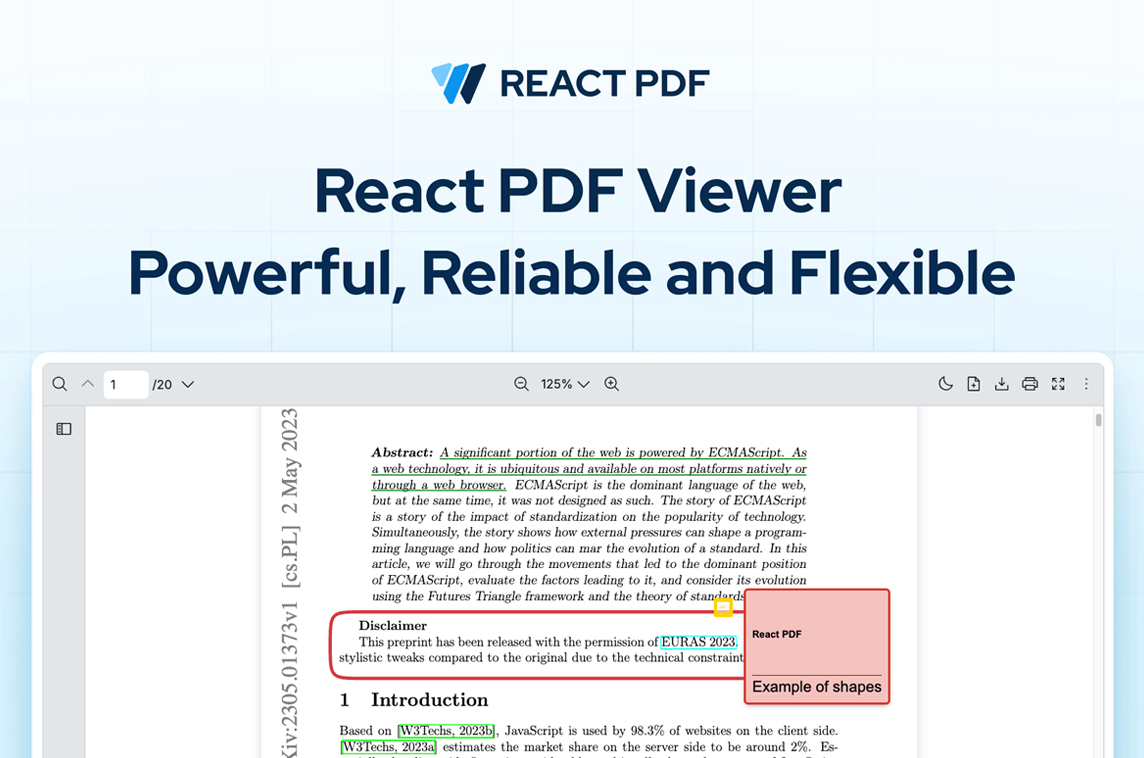 It has over 20+ features, including a default UI toolbar that can be customized further via React Context APIs. You can drop React PDF viewer right onto your page and done. That’s weeks of development back in your calendar so you can build something cool with the time you saved."