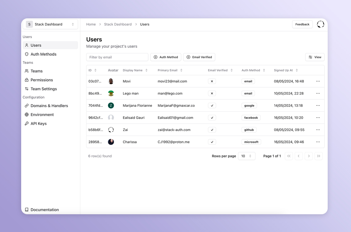 Stack Auth gets you started in just five minutes, after which you'll be ready to use all of its features as you grow your project. Our managed service is completely optional and you can export your user data and self-host, for free, at any time.