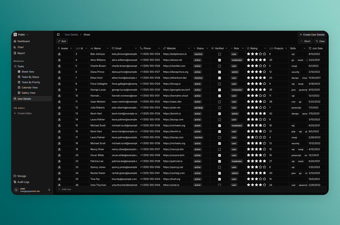 Supasheet is built with Next.js, React, Tailwind CSS and Shadcn UI."